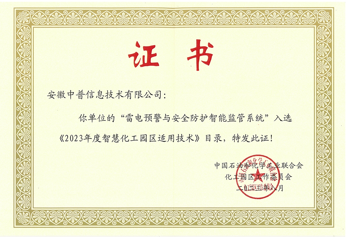 在近200個申報項目中,經過專家多輪評選和答辯,中普科技“雷電預警與安全防護智能監管系統”技術脫穎而出,成功入選2023年度智慧化工園區適用技術目錄。