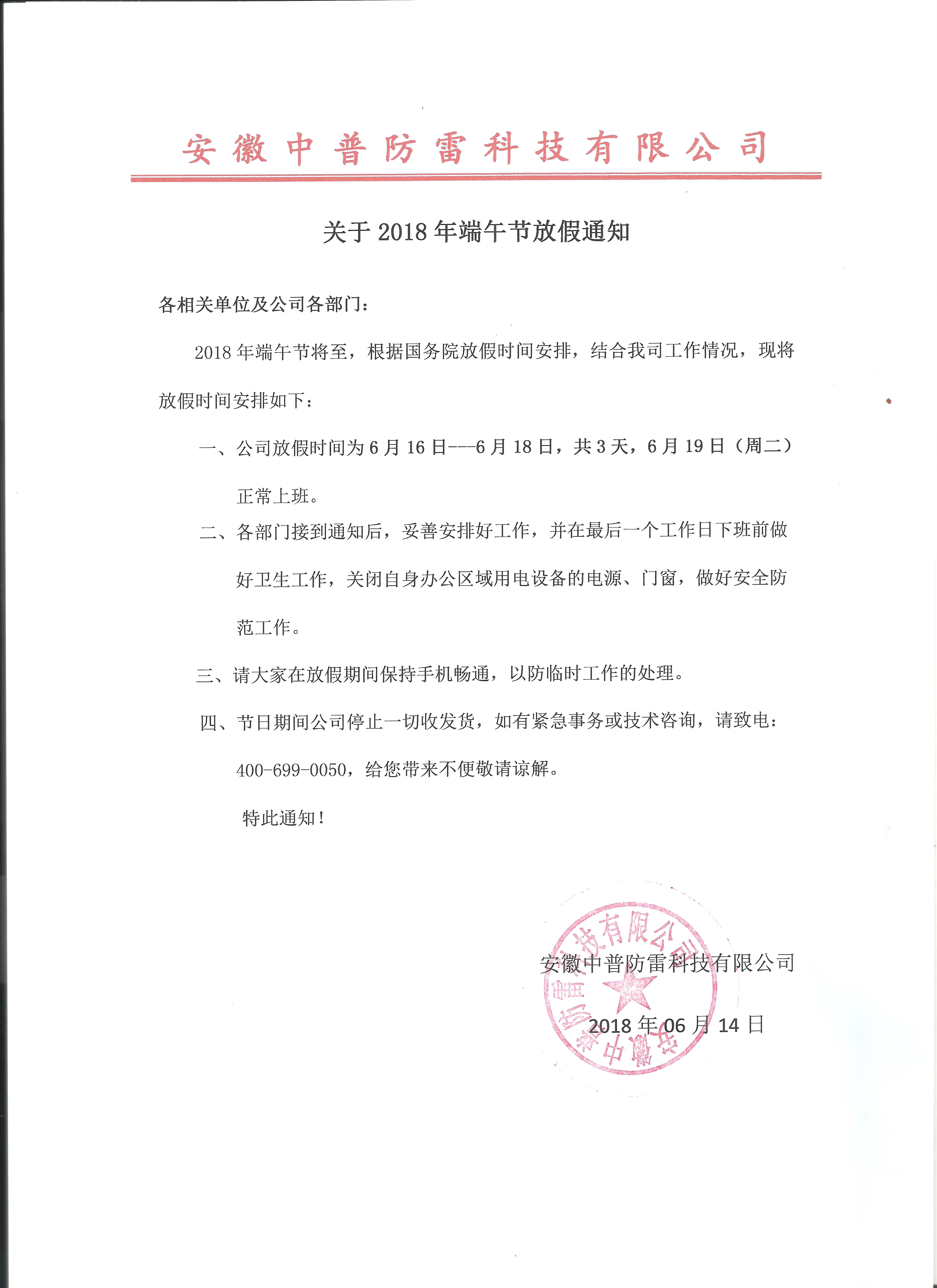 安徽中普防雷“關于2018年端午節(jié)放假通知”