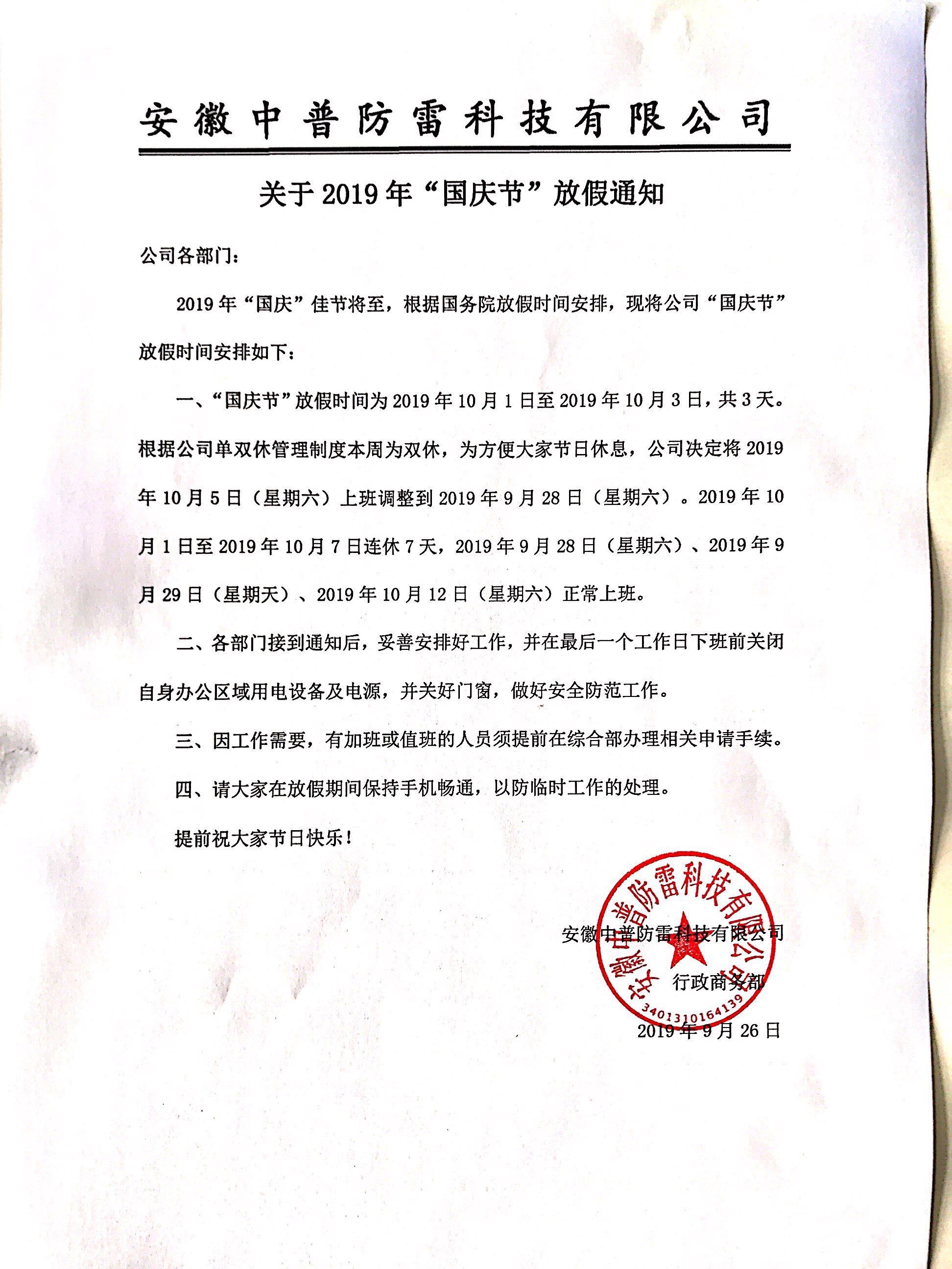 安徽中普防雷“關于2019年國慶節放假通知”