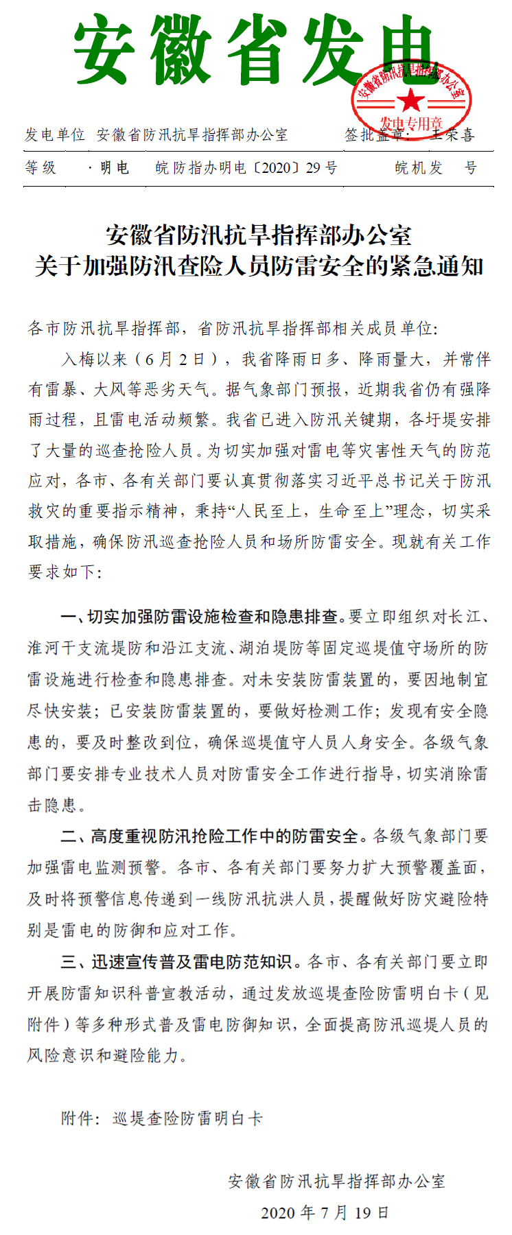 通知要求各市、各有關部門切實采取措施,確保防汛巡查搶險人員和場所防雷安全。